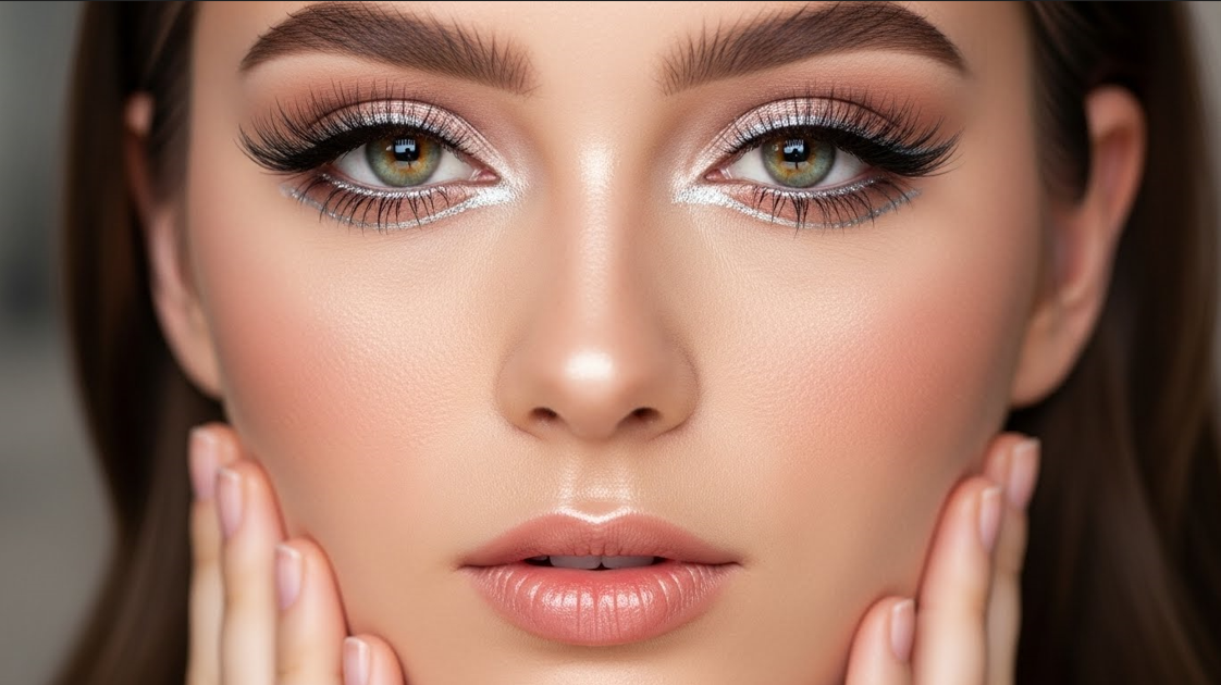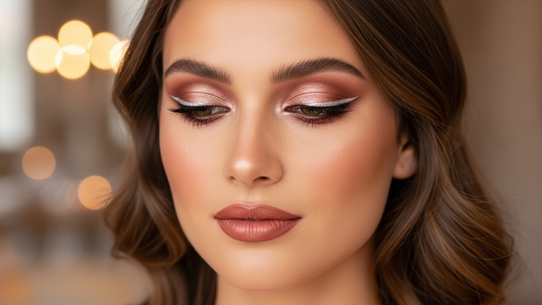 A pop of silver in the inner corners brightens the eyes and adds soft sparkle.
