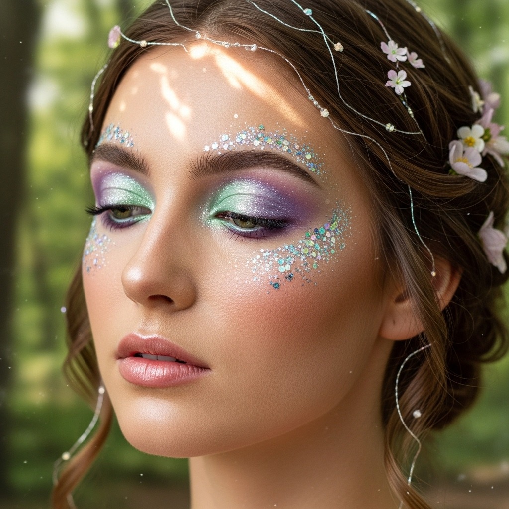 A magical trend for 2025, fairy glam includes shimmery shadows, soft pastels, and glitter accents that create a dreamy enchanted vibe. Pair with glossy lips and radiant highlighter to enhance the ethereal style.