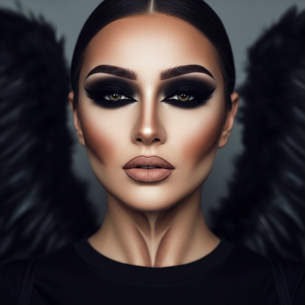 This look features dramatic black smokey eyes, sharp contour, and matte nude lips to create a dark and mysterious angel aesthetic. It’s ideal for those wanting a bold but polished Halloween style.