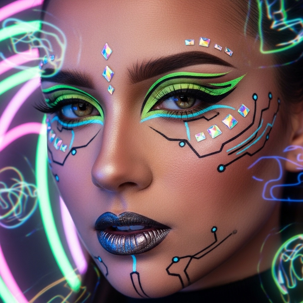 Neon liner, bold colors, and futuristic geometric shapes define the 2025 cyberpunk trend. This look is edgy, modern, and perfect for night parties or glowing settings.