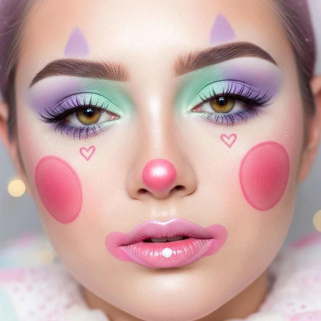 This cute clown look adds heart shapes, soft blush circles, and colorful shadows for a playful Halloween appearance. It’s beginner-friendly and great for social media photos.