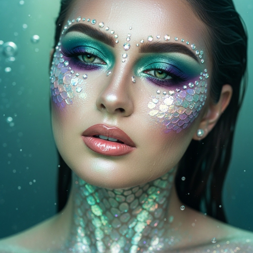 Image Prompt: mermaid makeup, shimmering scales, teal and purple eyeshadow, iridescent highlighter, ocean glow lighting, fantasy portrait.
