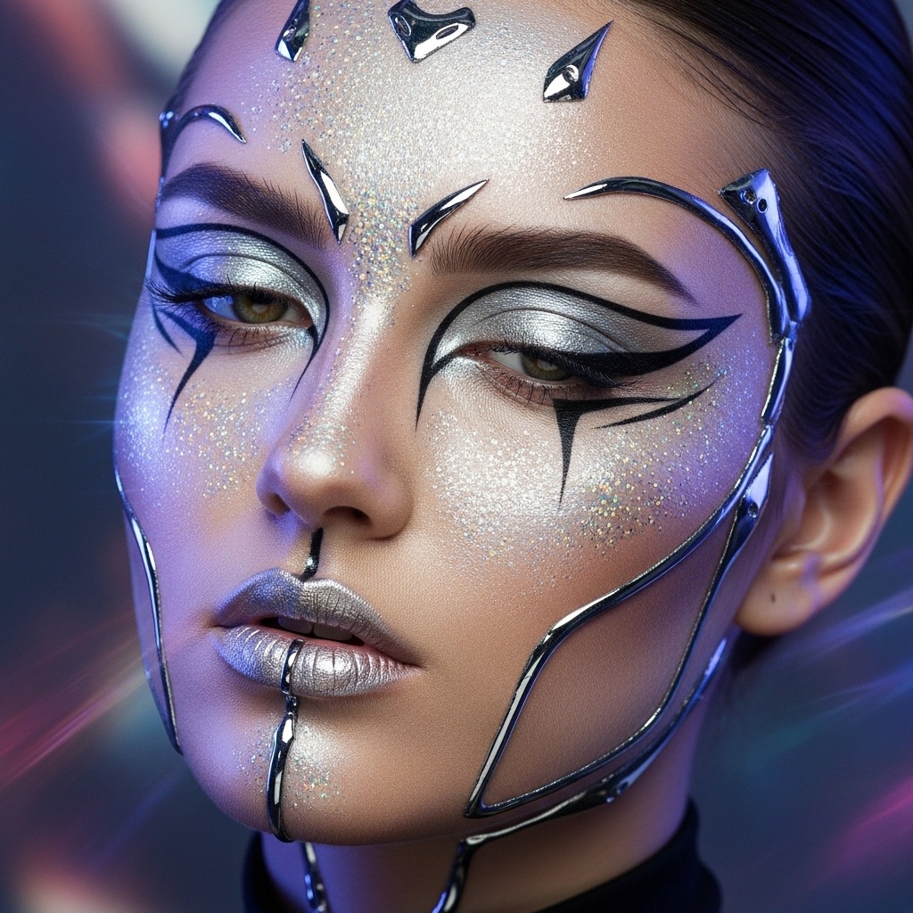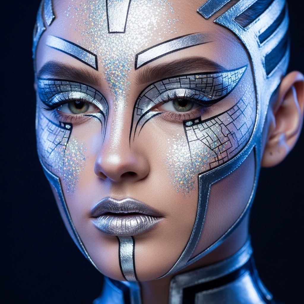 This futuristic alien makeup uses metallic silver shadows, holographic highlights, and graphic liner to create an out-of-this-world aesthetic. It’s bold, modern, and becoming a major 2025 trend thanks to sci-fi themed costumes. Add rhinestones or chrome accents for extra dimension and shine.