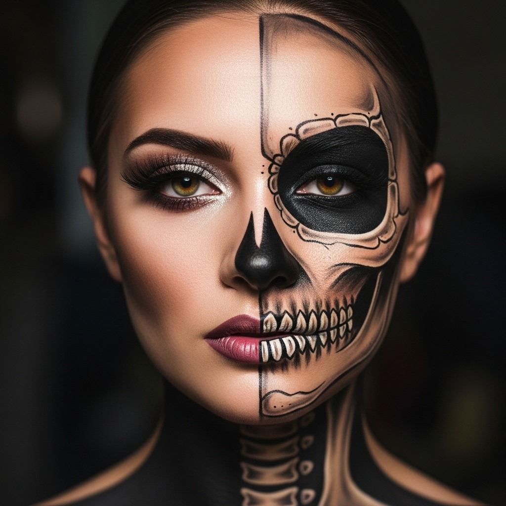 The half-skeleton look stays trending in 2025 for its bold contrast and dramatic detail. One side remains glam, while the other features black-and-white bone outlines for a striking transformation. It’s perfect for makeup lovers who enjoy artistic effects and high-impact Halloween styles.