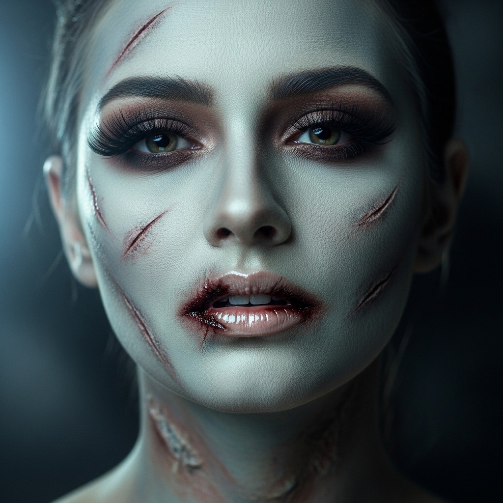 Zombie soft glam blends subtle wounds, faded veins, and pale tones with glam lashes and glossy lips for a modern creepy-cute style. It’s ideal for those wanting horror vibes without going extreme.